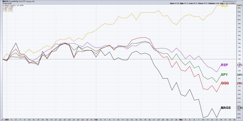 The S&P 500 index is now down about 4.0% for the year, even with Friday’s strong finish to the week. The Roundhill Big Tech ETF (MAGS) is down 12.4%, while the growth-heavy Nasdaq 100 is down about 6.2%. The SPDR Gold Shares (GLD), meanwhile, is up another 13.7% in 2025 after an exceptionally strong 2024.
