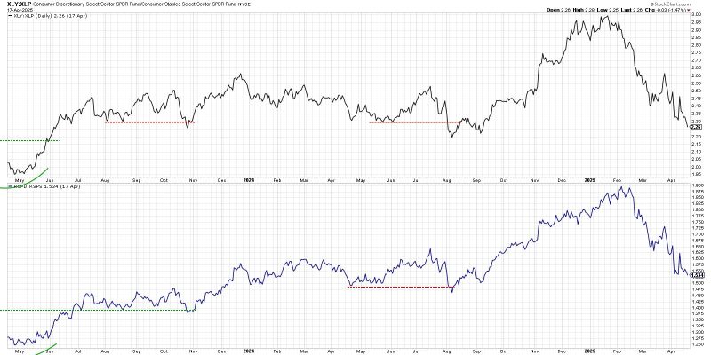 Fast-forward to February and March and you’ll see how Consumer Discretionary rotated into the Weakening and then Lagging quadrant. Meanwhile, Consumer Staples strengthened during that same period. At this point, the RRG is telling me defense over offense, in a classic bearish configuration.