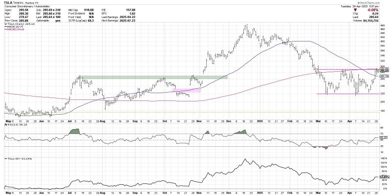 After peaking in December 2024 around $480, TSLA dropped to a March 2025 low around $220. From there, the price has rotated between the 200-day moving average as resistance and that $220 level as support. To be clear, the countertrend rallies in March and April have been impressive, but they have not yet provided enough upside pressure to propel Tesla back above the crucial 200-day moving average.